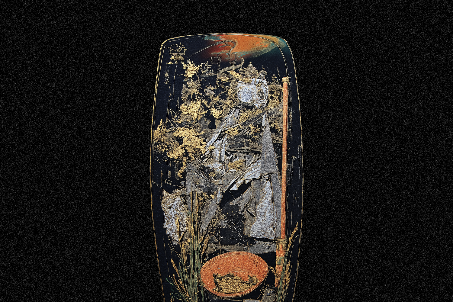 漆器沉默地承載一切。金色是稻米,是某個人一季的勞動;銀色是石,是更古老的時間;那些碎裂的、堆疊的、壓在最底部不知道是什麼的,是所有被帶走又被留下的,是那些沒有說出口就已經結束的。